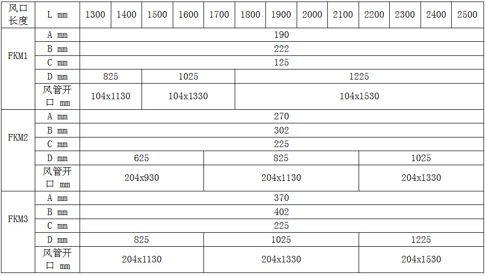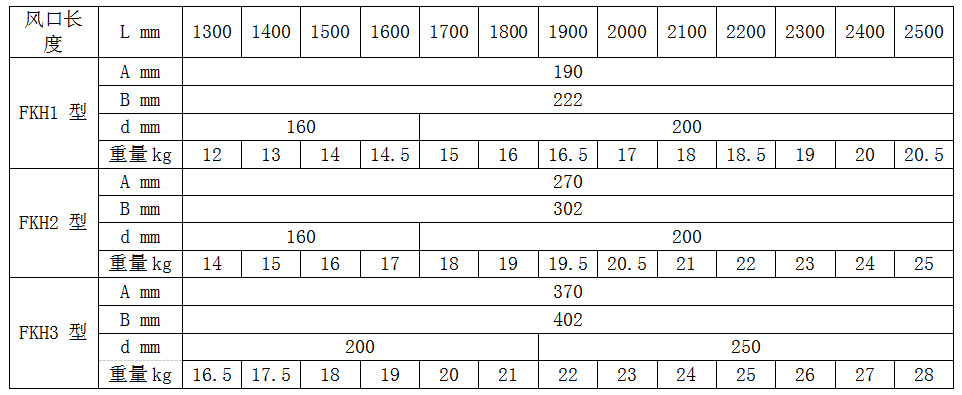 FKH型送風(fēng)口又有三種型號,具體尺寸如下表所示:
