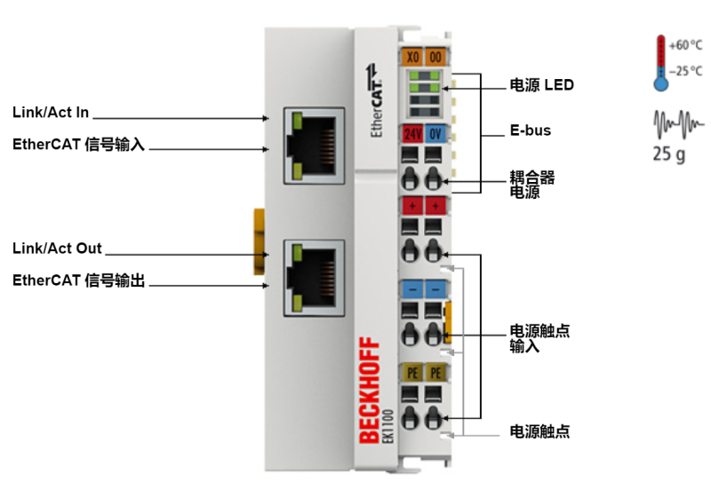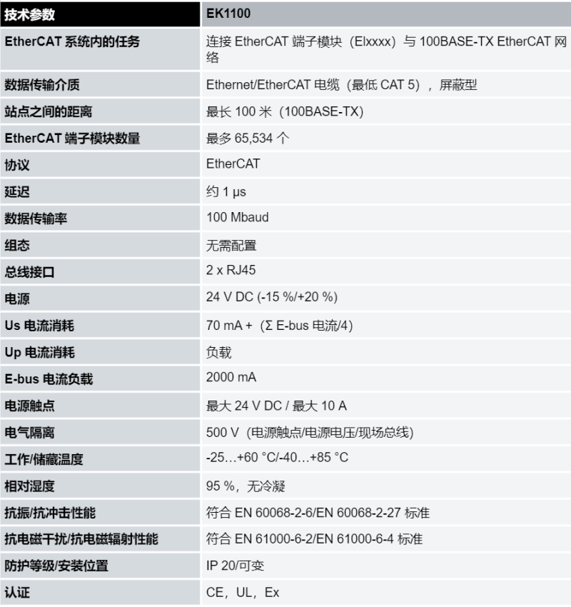 EK1100 耦合器用于連接 EtherCAT 與 EtherCAT 端子模塊(Elxxxx)。一個站點由一個 EK1100 耦合器、任意多個 EtherCAT 端子模塊和一個總線末端端子模塊組成。該耦合器將來自 Ethernet 100BASE-TX 的傳遞報文轉(zhuǎn)換為 E-bus 信號。