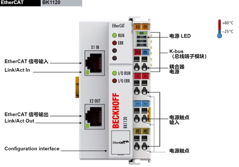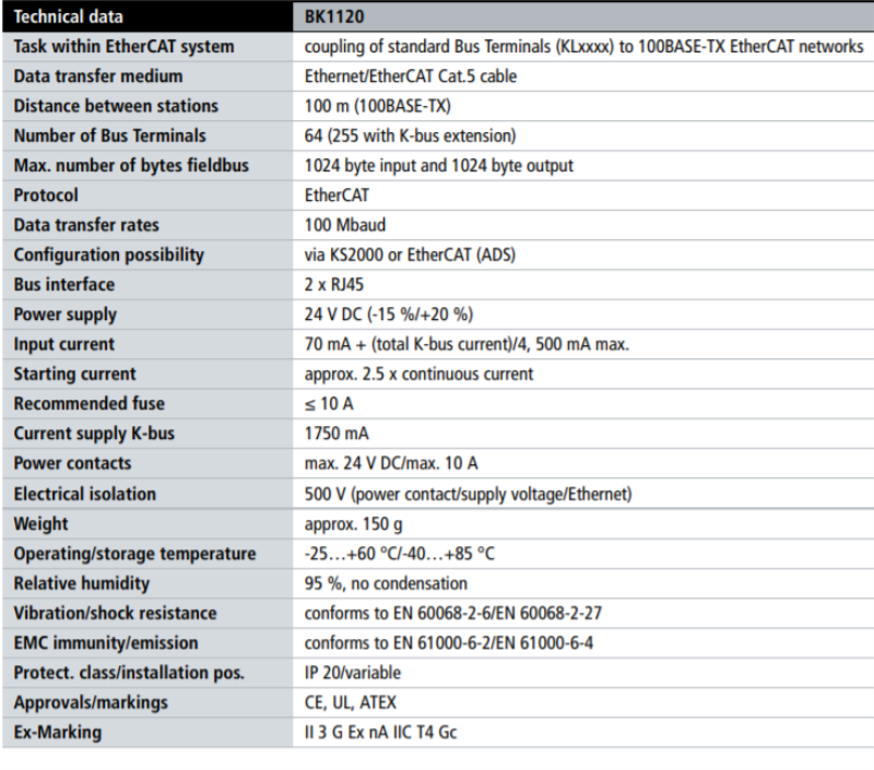 BK1120 總線耦合器用于將 EtherCAT 與成熟的倍??偩€端子模塊系列中的 K-bus 組件(KLxxxx)相連。一個站點由一個 BK1120 總線耦合器、任意多個端子模塊(最多 64 個;通過 K-bus 擴展時最多 255 個)和一個總線末端端子模塊組成。該總線耦合器可識別所連接的端子模塊,并自動將它們分配到 EtherCAT 過程映像中??偩€耦合器通過上面的以太網(wǎng)接口與網(wǎng)絡(luò)相連。下面的 RJ45 接口可用于連接同一網(wǎng)段上的其它 EtherCAT 設(shè)備。在 EtherCAT 網(wǎng)絡(luò)中,可將 BK1120 總線耦合器安裝在以太網(wǎng)信號傳輸段(100BASE-TX)中的任意位置,但不能直接與交換機相連。耦合器 BK9000(用于 K-bus 組件)可直接與交換機相連。
